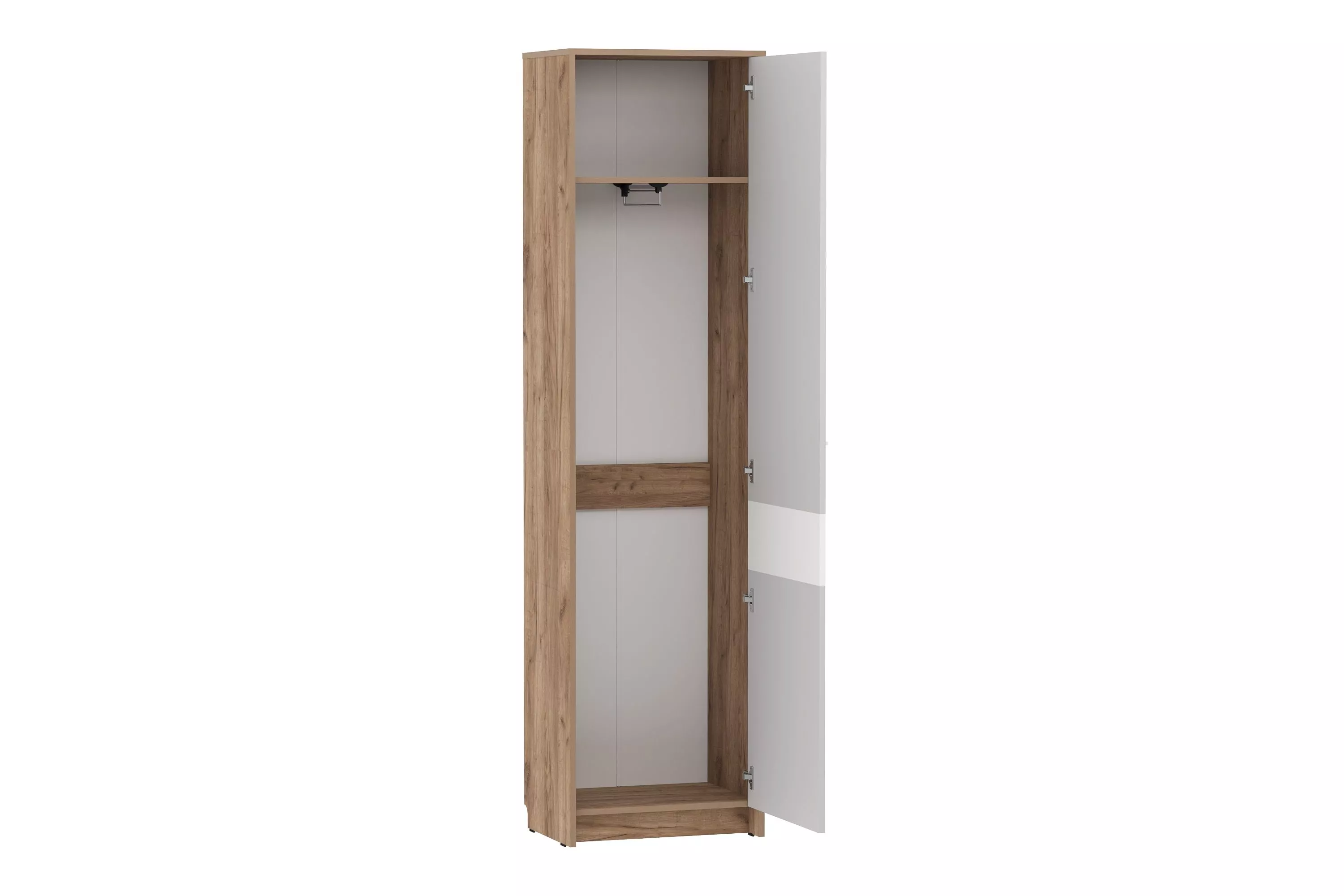 Шкаф оснащен выдвижной штангой, на которую удобно повесить верхнюю одежду на вешалках, а также отдельной полкой для размещения головных уборов и прочих вещей. Шкаф может быть собран как на правую, так и на левую стороны. Дополните шкаф тумбой и зеркалом из одноименной коллекции, чтобы оптимизировать место хранения в прихожей и создать особо гармоничную атмосферу!