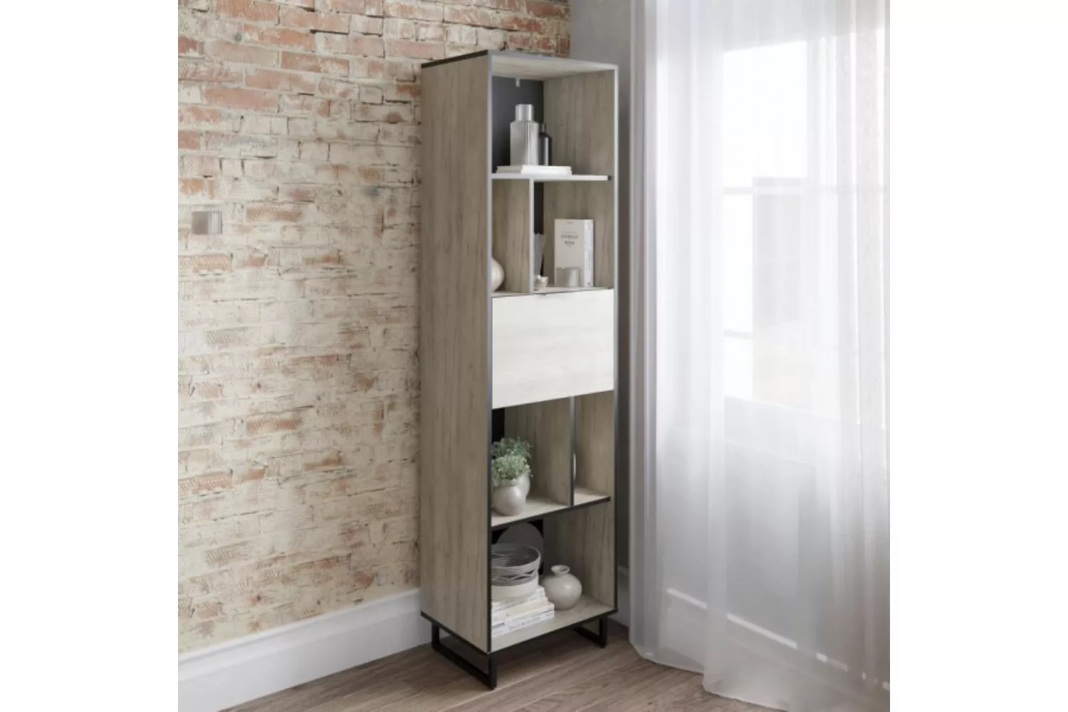 Стеллаж Лира легко впишется в интерьер гостиной в стиле Лофт, придав ей современный и монументальный вид. Черная лаконичная ручка и металлические опоры подчеркивают оригинальный дизайн мебели, а черная кромка эффектно выделяет фасад изделия.