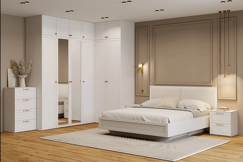 Модульная композиция включает шкафы и антресоли с глухими фасадами и фасадом с зеркалом для размещения одежды, а также кровать и тумбы.