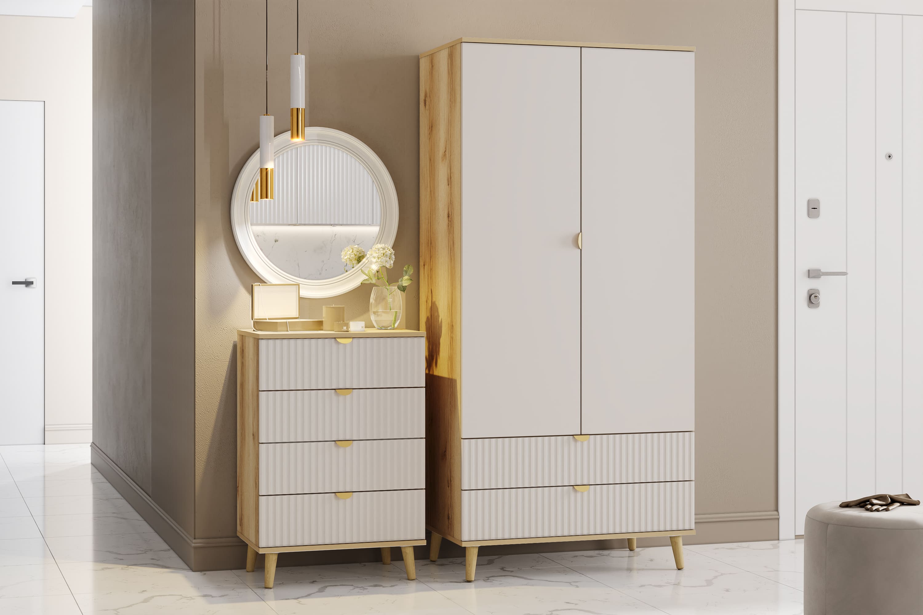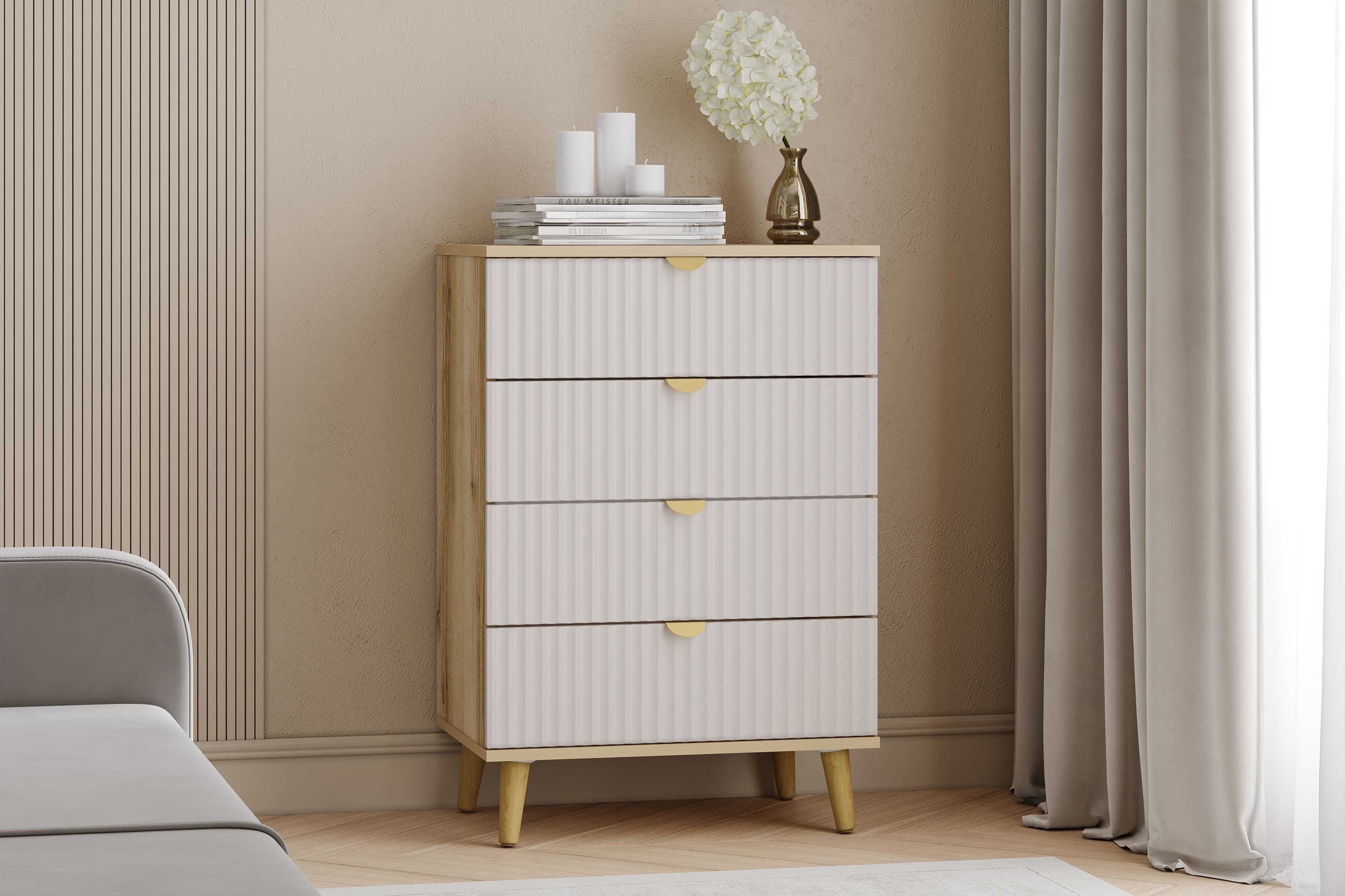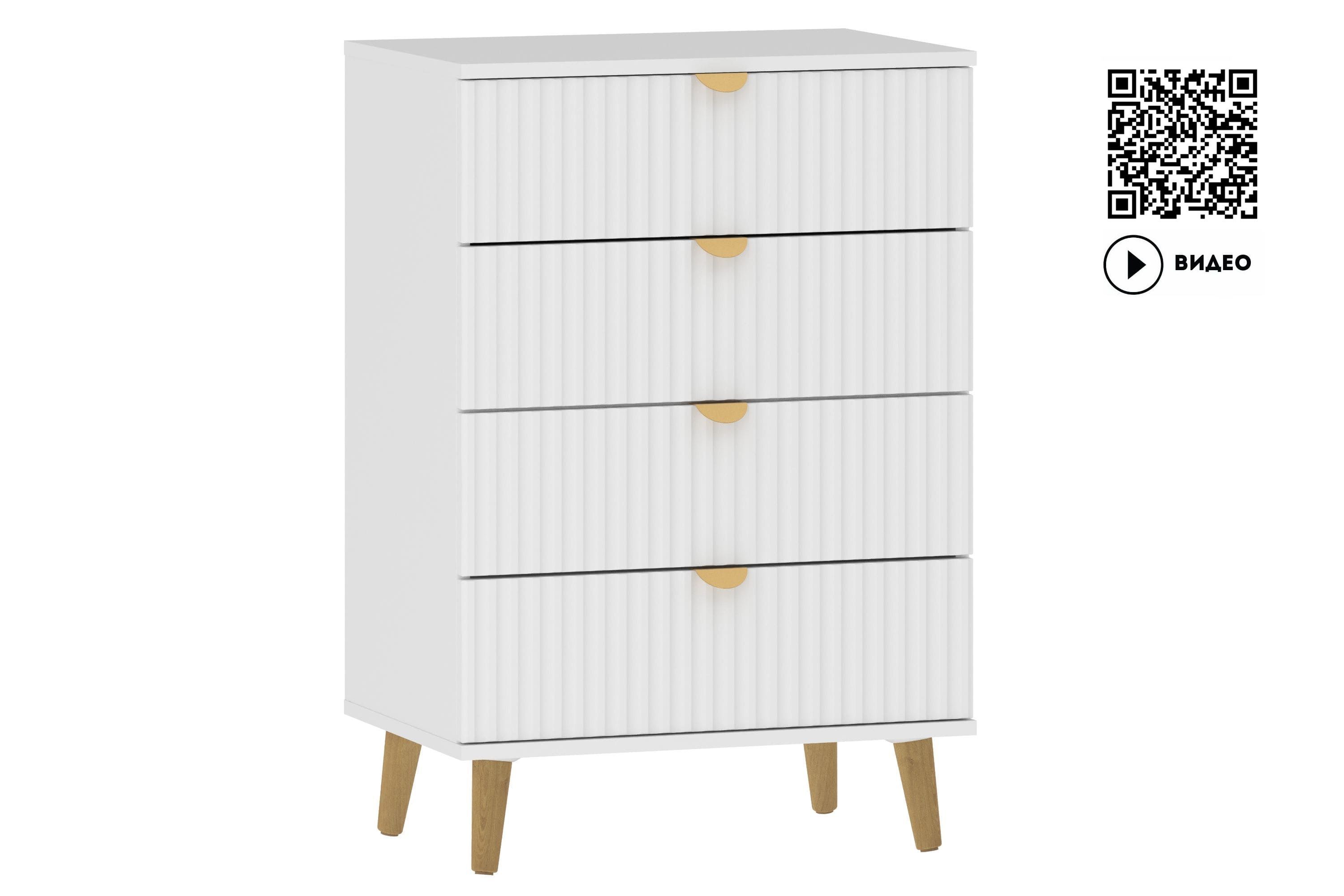 Комод оснащен четырьмя выдвижными ящиками, которые открываются плавно и бесшумно благодаря шариковым направляющим, а высокие опоры облегчают процесс уборки.