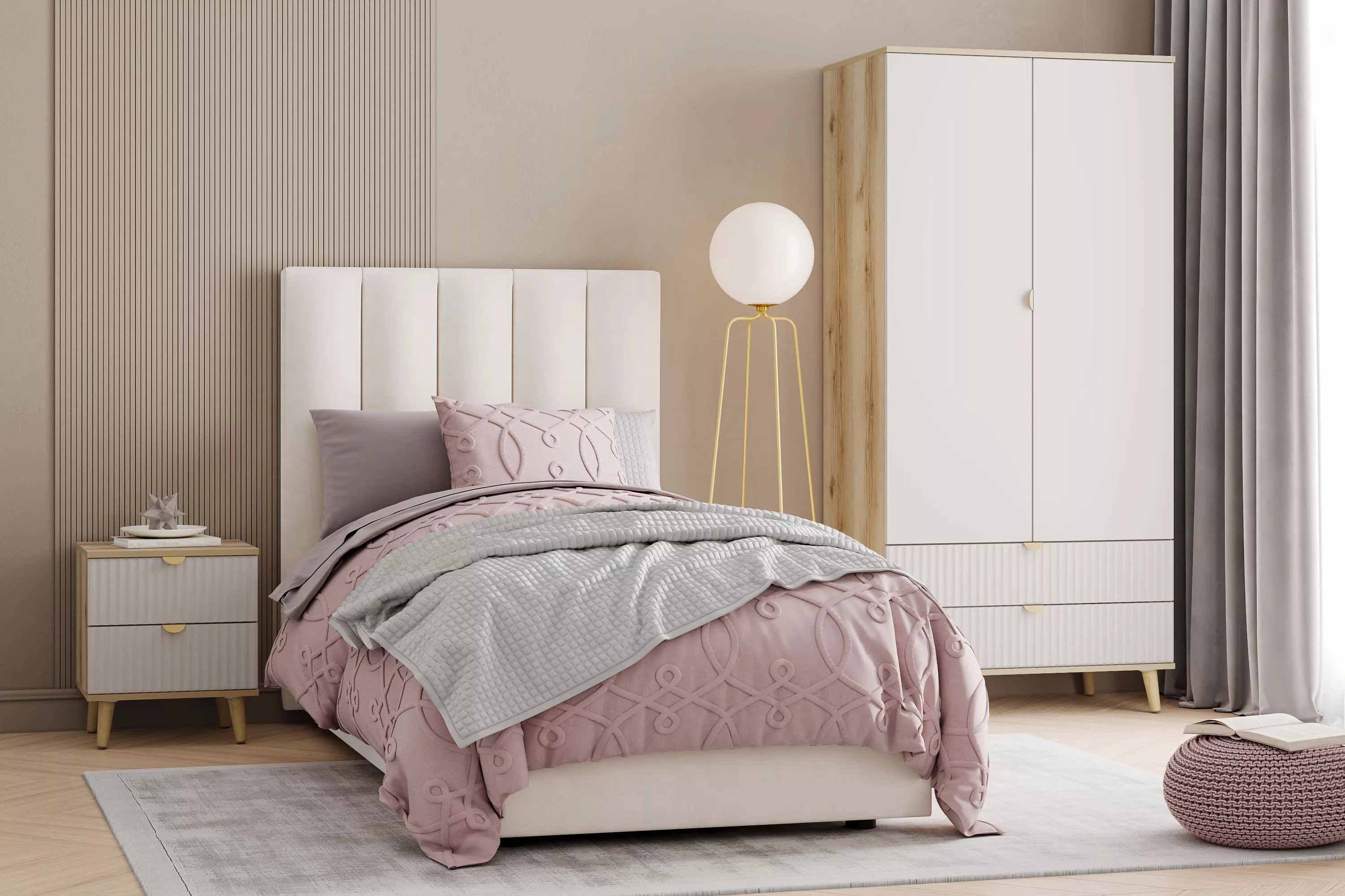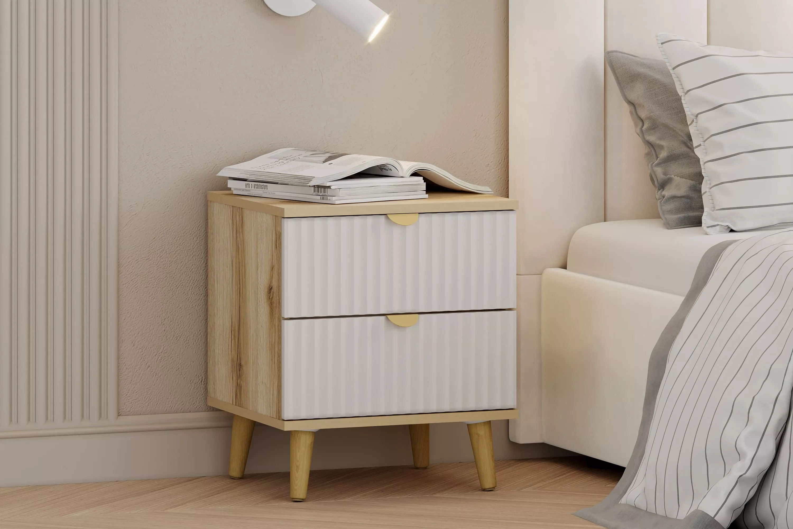 Прикроватная тумба оснащена двумя выдвижными ящиками, которые открываются плавно и бесшумно благодаря шариковым направляющим, а высокие опоры облегчают процесс уборки.