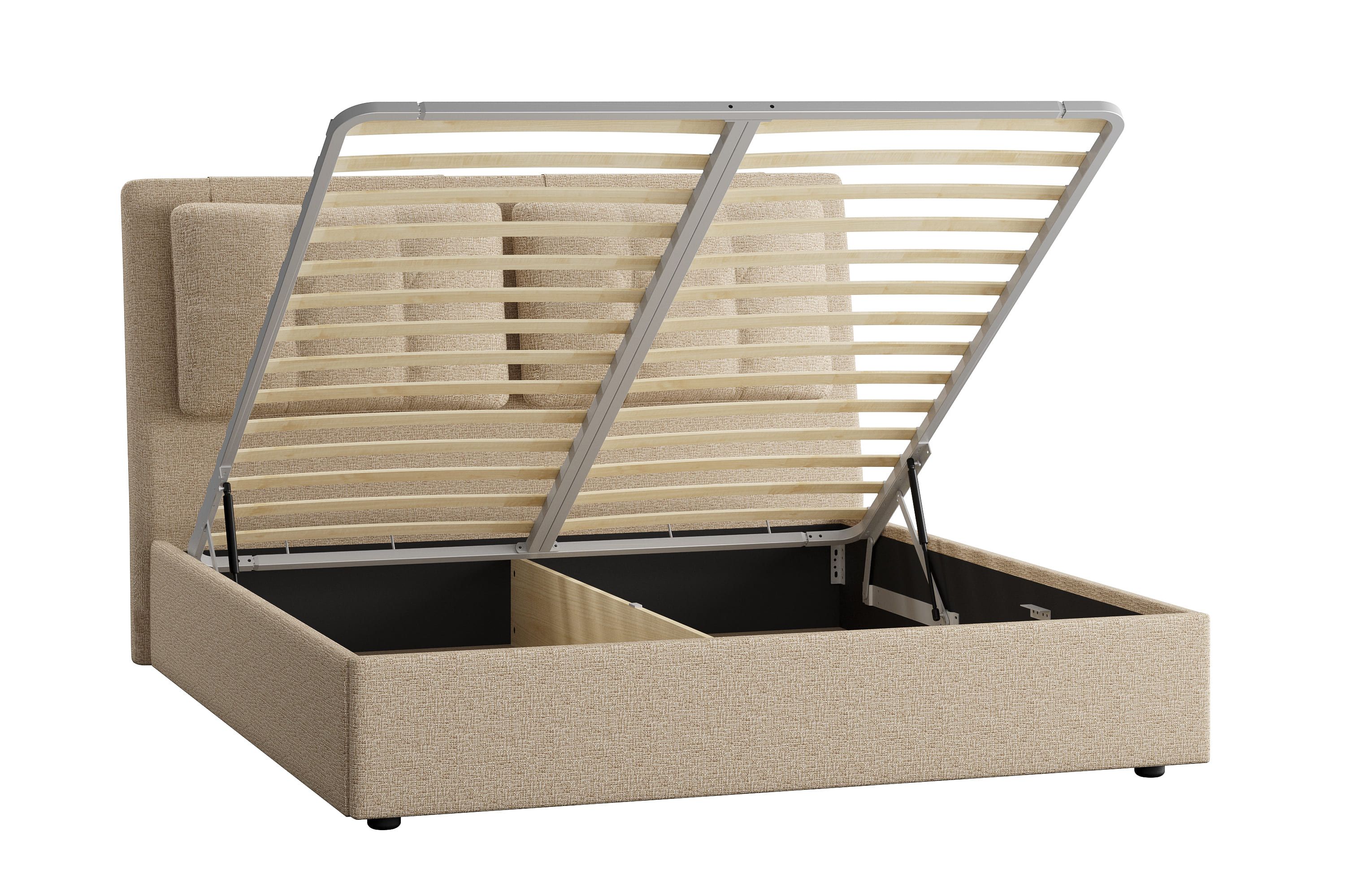 Кровати выполнены как в нейтральных, так и в ярких тканях велюр, что позволяет подобрать подходящий вариант почти под любой интерьер. В качестве оформления применяются декоративные подушки на изголовье. Подъемный механизм легок в управлении, а вместительный короб внутри кровати подойдет для хранения подушек, белья и других вещей.