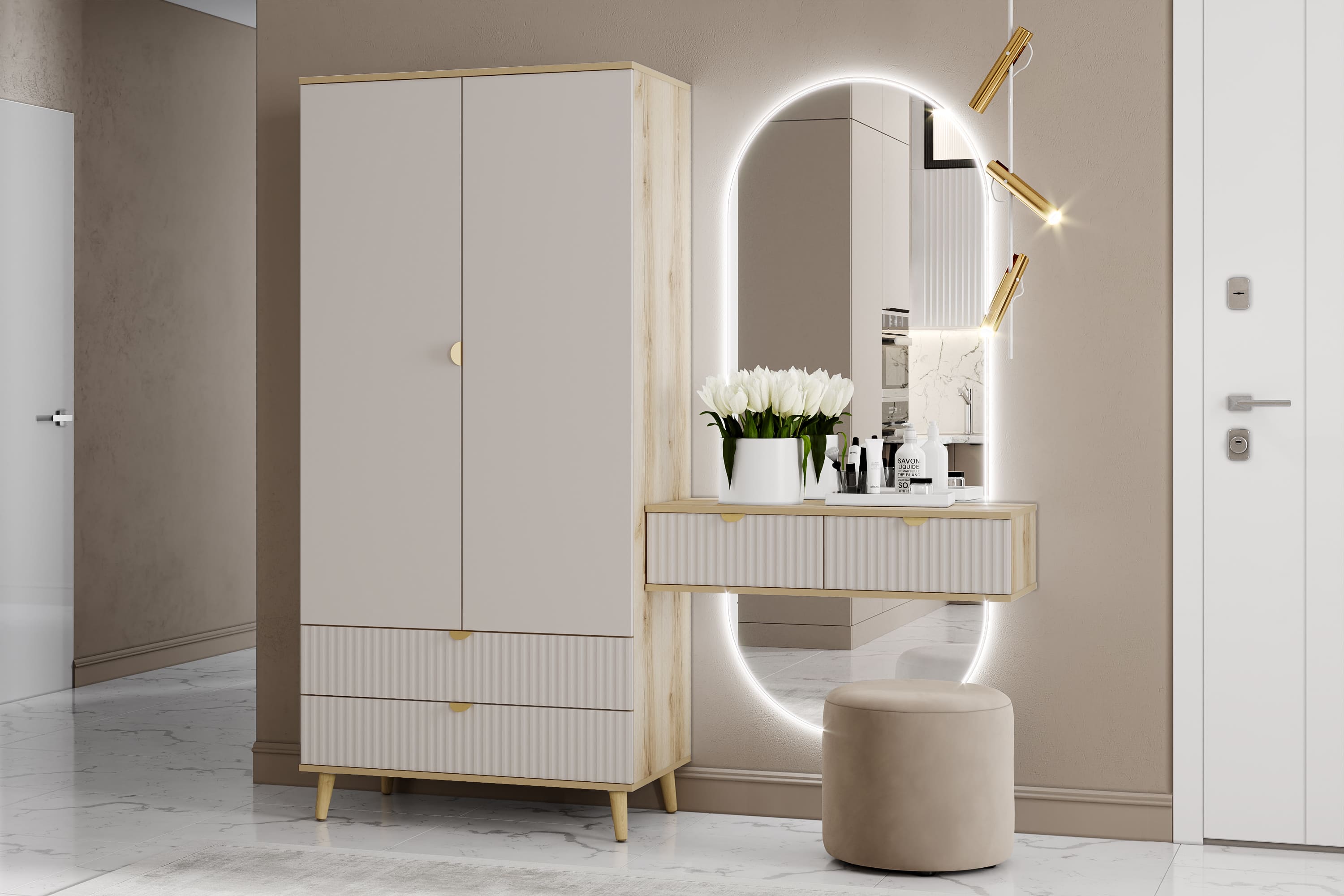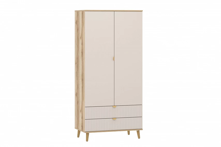 Шкаф оснащен двумя выдвижными ящиками, которые открываются плавно и бесшумно благодаря шариковым направляющим, полками, а также овальной штангой для организации предметов гардероба, а высокие опоры облегчают процесс уборки.
