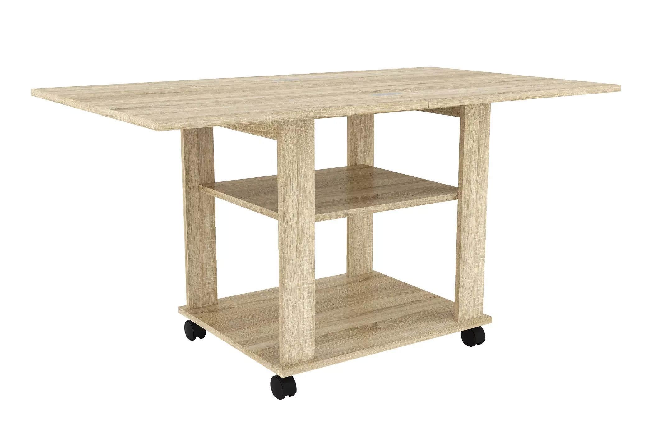 Благодаря поворотному механизму и подвижному соединению столешниц его можно раскладывать для увеличения площади. Если планируется частое использование мебели в различных комнатах, то колеса облегчат перемещение. Все механизмы конструкции обладают простым использованием.